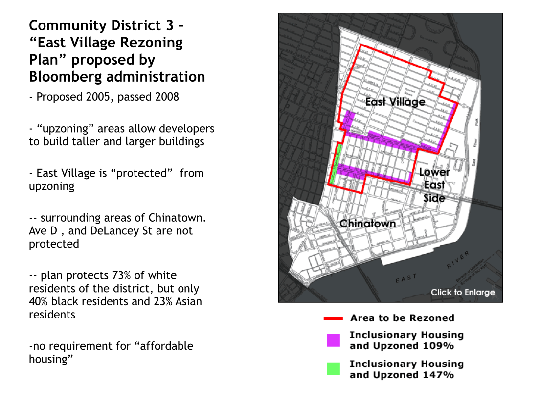 In 2008, the East Village was rezoned to protect their neighborhood from luxury development and the displacement that goes with it. Chinatown and the Lower East Side, poorer communities of color, were intentionally excluded even though all 3 neighborhoods are part of the same Community District.