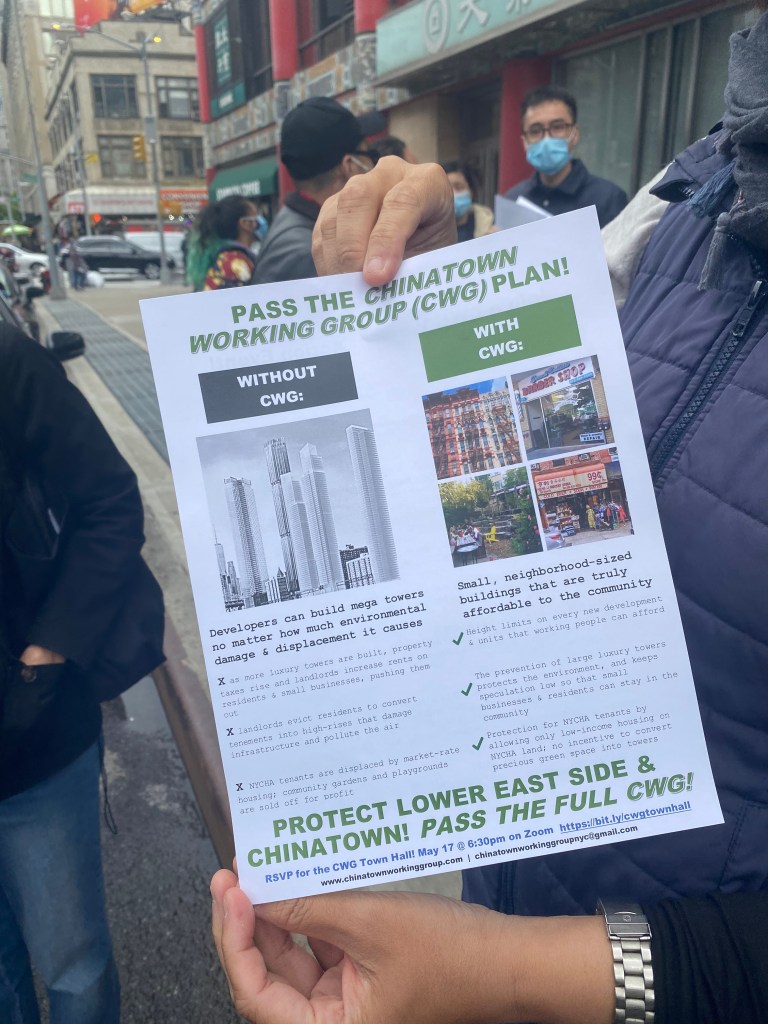 The Coalition to Protect Chinatown & The Lower East Side supports the passage of the Chinatown Working Group Rezoning Plan, a community-led plan that stops displacement in Chinatown and the Lower East Side. The plan prevents luxury high rises and requires new housing to be truly affordable to the community among other protections. Join the member groups of the Chinatown Working Group for an action-packed week of organizing to help spread the word about the CWG Plan to our friends and neighbors!