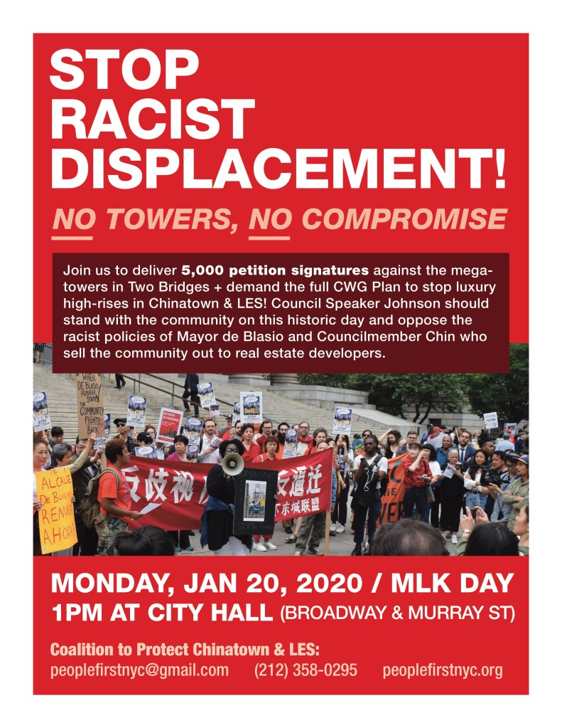 We will not be fooled by these lackeys of corrupt politicians into seeing our neighbors as enemies and Chin and de Blasio as our friends. Our fight against the Two Bridges towers and for equal protection has shown that only through unifying all of Chinatown and the Lower East Side are we able to take control over the future of our communities. United we stand, divided we fall. Let’s reject the City and its supporters’ misleading and divisive narrative, and instead, join forces to demand the City pass the full CWG plan!