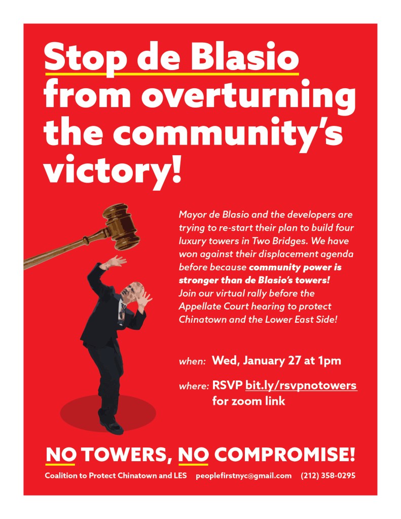 After months of delays and postponements, the appellate court will hear our case against the Two Bridges towers on Wednesday, January 27, at 2pm. We’re writing to invite you to listen to the case, and participate in our pre-hearing virtual rally and press conference at 1pm.